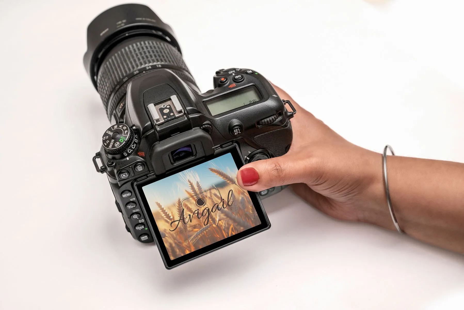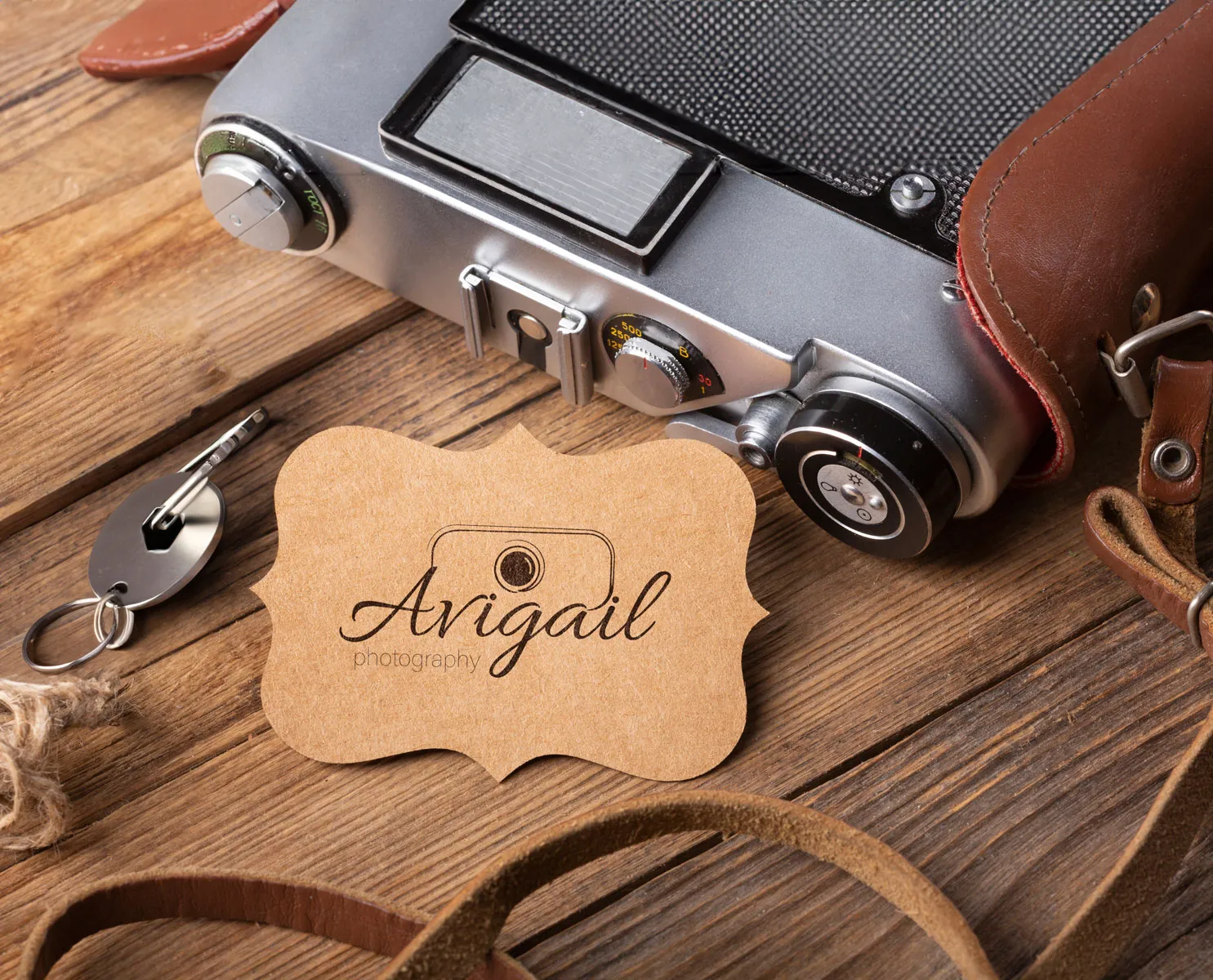 החיבור בין טיפוגרפיה סקריפטית זורמת לבין אייקון מצלמה מינימליסטי משדר איזון מושלם בין מקצועיות לרכות.